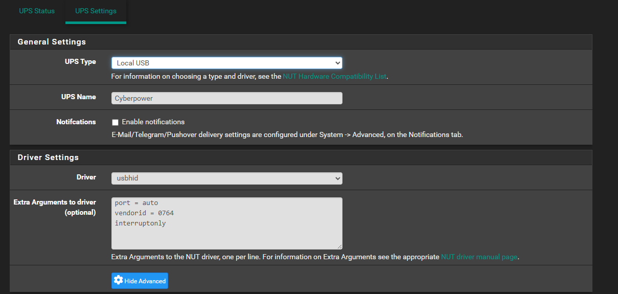 我目前是 Local USB 的狀態,讓 UPS 透過 USB 線直連 pfSense。
