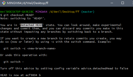 使用上面這個指令的話,HEAD 會移動到目標 commit,會進入斷頭狀態(detached HEAD),如果在這裡 commit 的話,會從這邊長出一個新的 commit。(但是沒有分支指向它。)